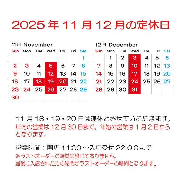 また、元日、旧暦の7月15日(2025年は9月6日)も定休日とさせていただいております。